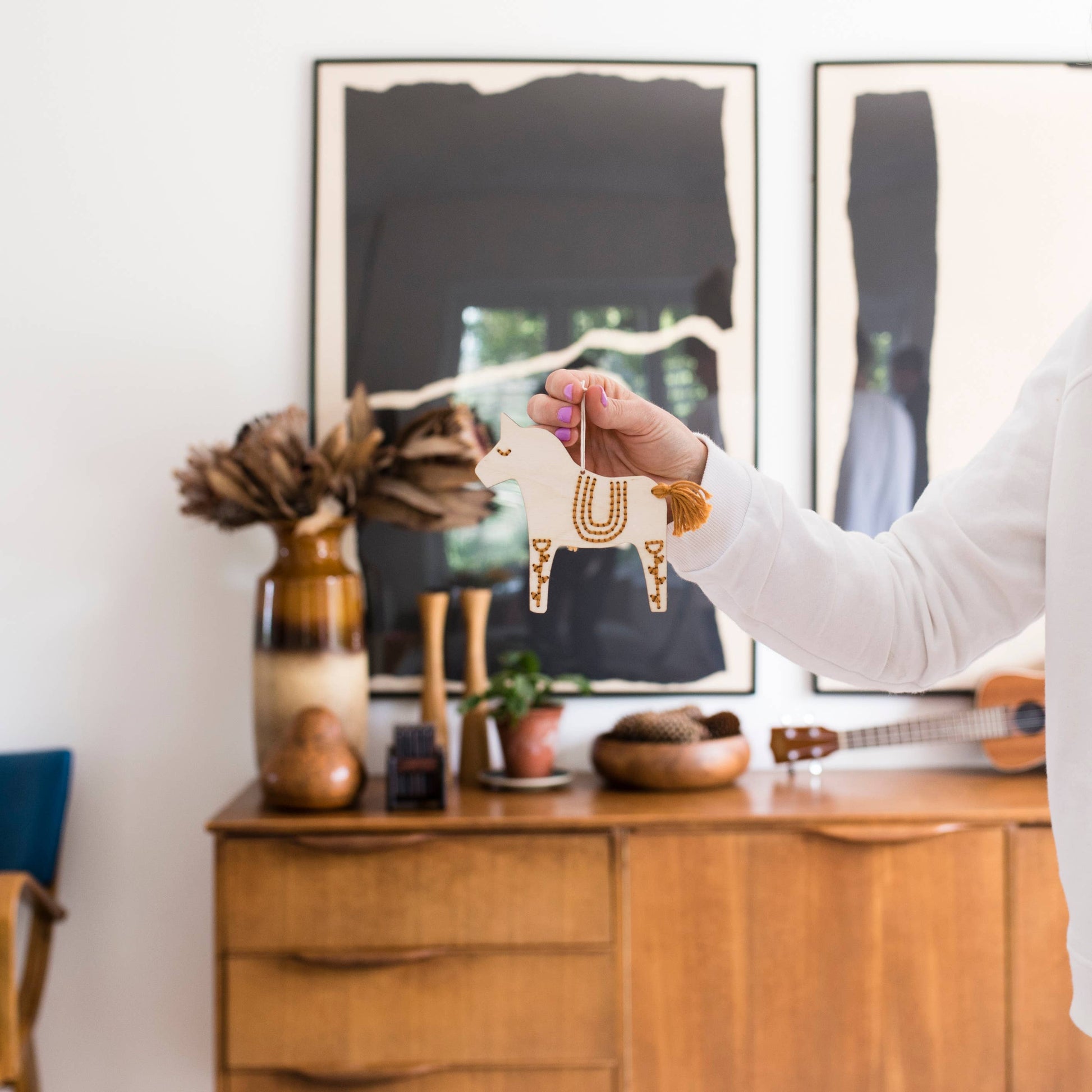 We love Dala horses, and anything Scandi really so we designed this really simple embroidery kit. Stitch these three different horses, then hang them as individual decorations or as a garland.