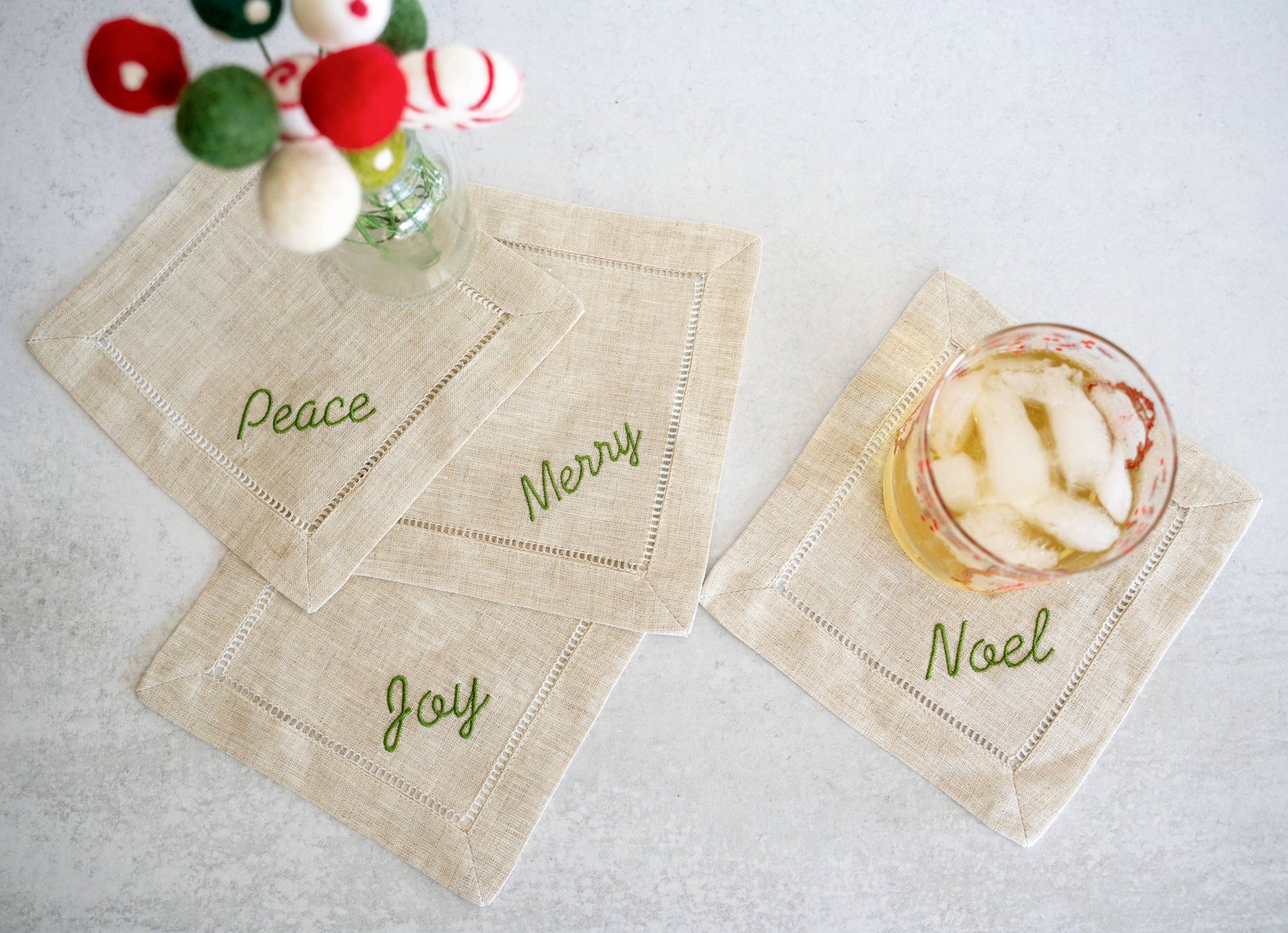 Classic and festive! 100% linen coasters, each embroidered with a different holiday word. Perfect for a cocktail party or as a gift.
